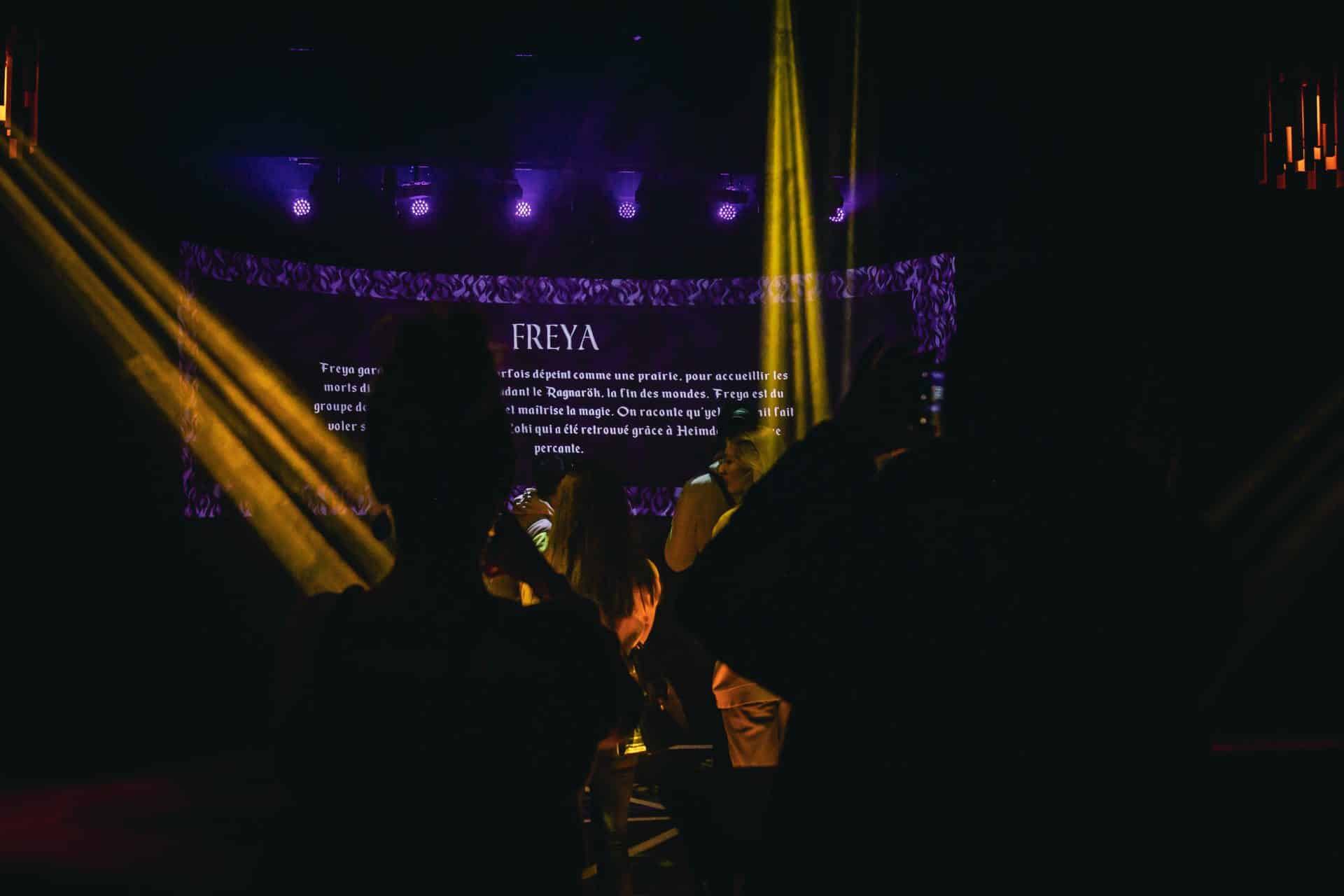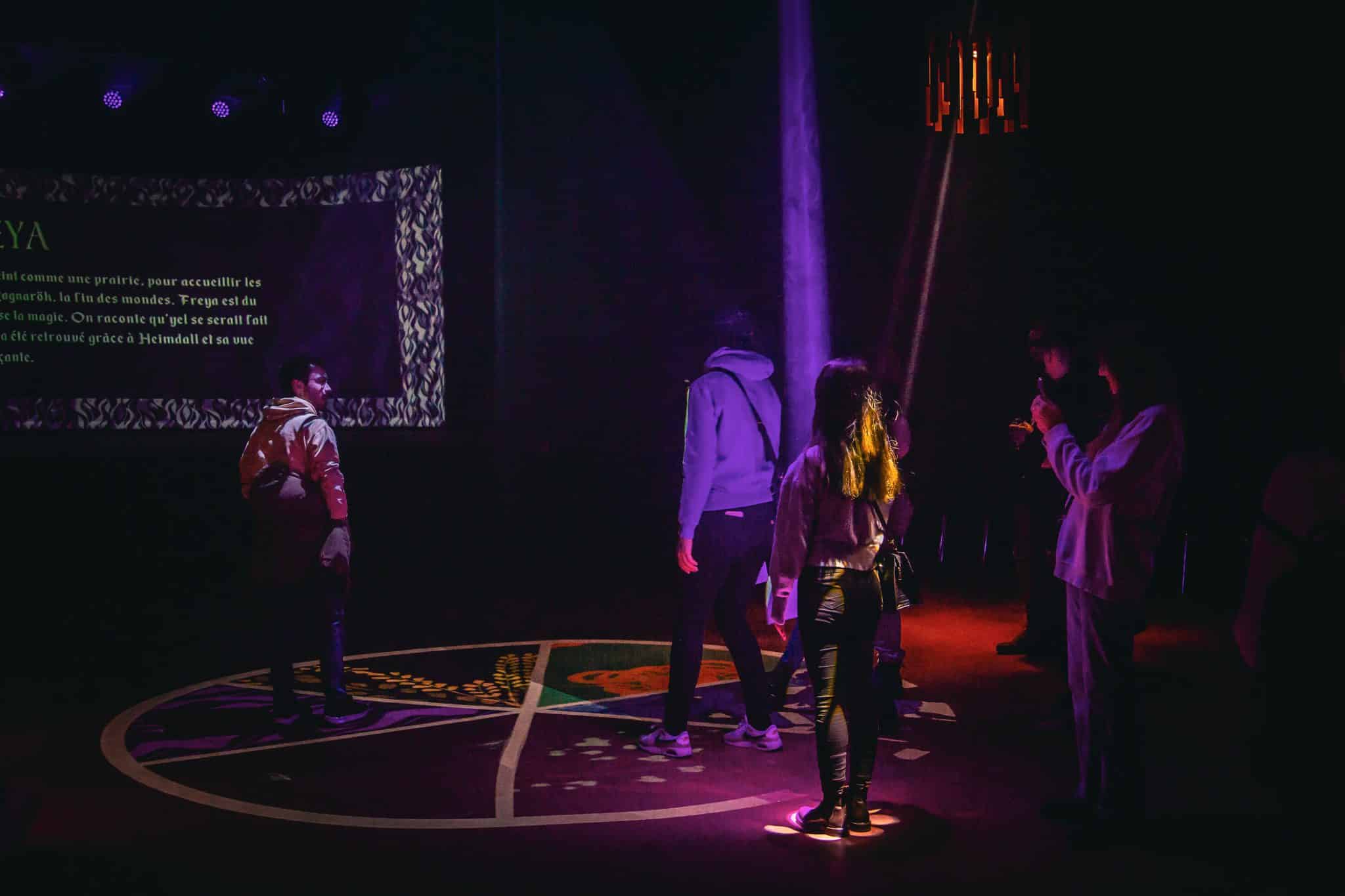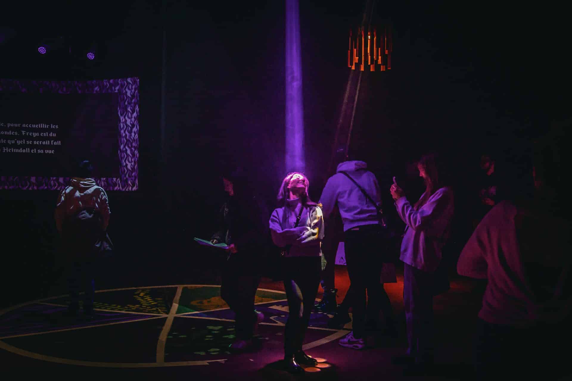 Ainsi, tout au long du parcours, les spectateur·rices passaient d’une ambiance sonore, visuelle et lumineuse à une autre en fonction des actions qu’ils réalisaient. À l’étage, iels pouvaient discuter dans une taverne viking et découvrir quelques divinités à l’aide de la roue des dieux·déesses interactive. Dans les escaliers, il fallait enclencher les épées de Heimdall, pour activer le portail arc-en-ciel de DEL. Venait ensuite la rencontre avec Hel, gardienne de Helheim qui hébergeait les esprits des morts déshonorables. Sa voix résonnait tout au long du parcours pour mettre en garde le·la spectateur·rice que la présence des vivant·es n’était pas la bienvenue au royaume des morts. Après être remonté des tréfonds du monde, le public assistait au Ragnarök, narré sur scène par la comédienne Camille dans une ambiance rouge sang. On comprend alors que les vikings voyaient le monde comme une succession de périodes de catastrophes puis de reconstruction et ce selon un cycle infini.
