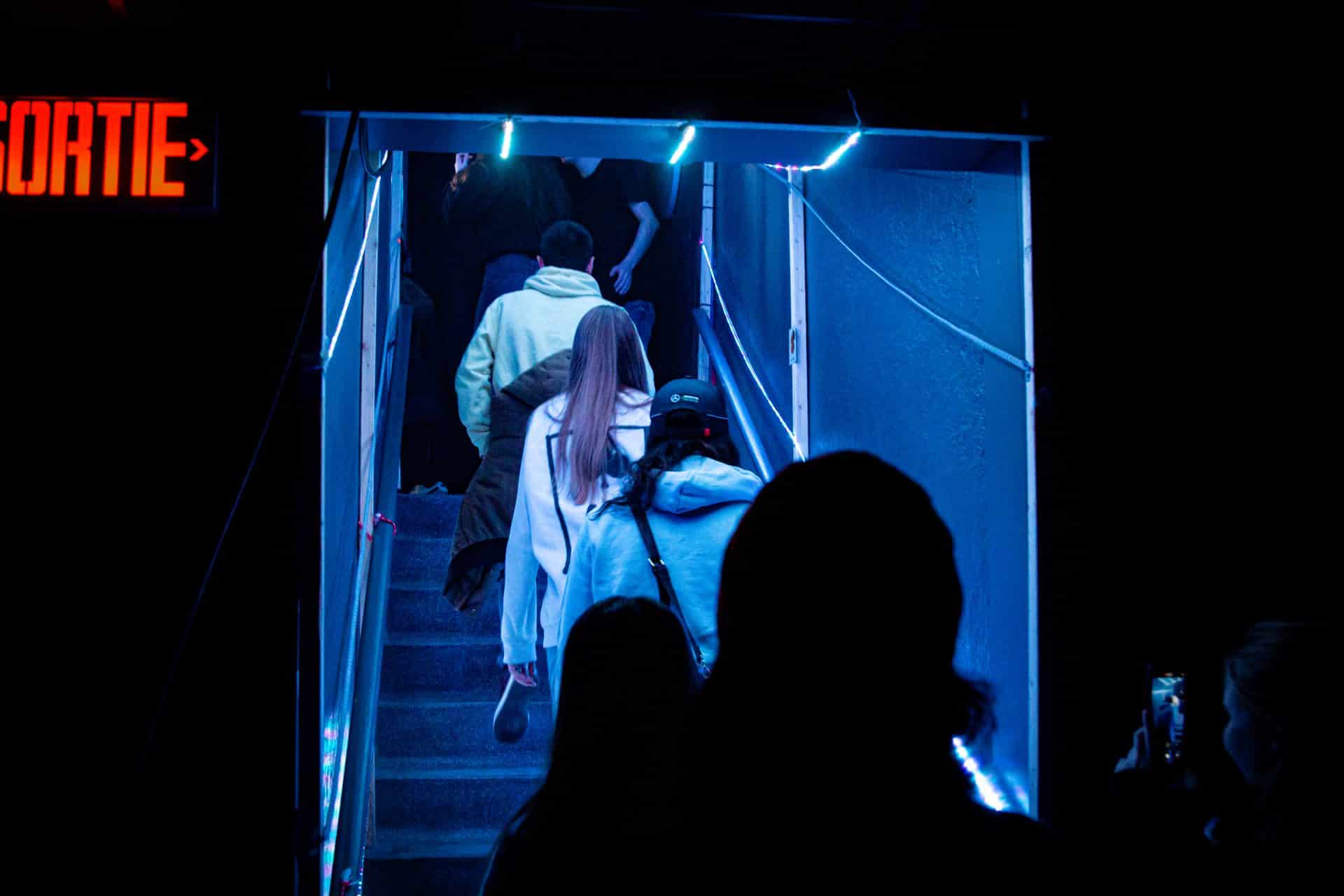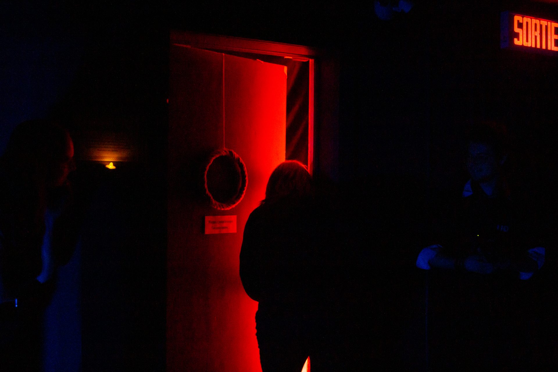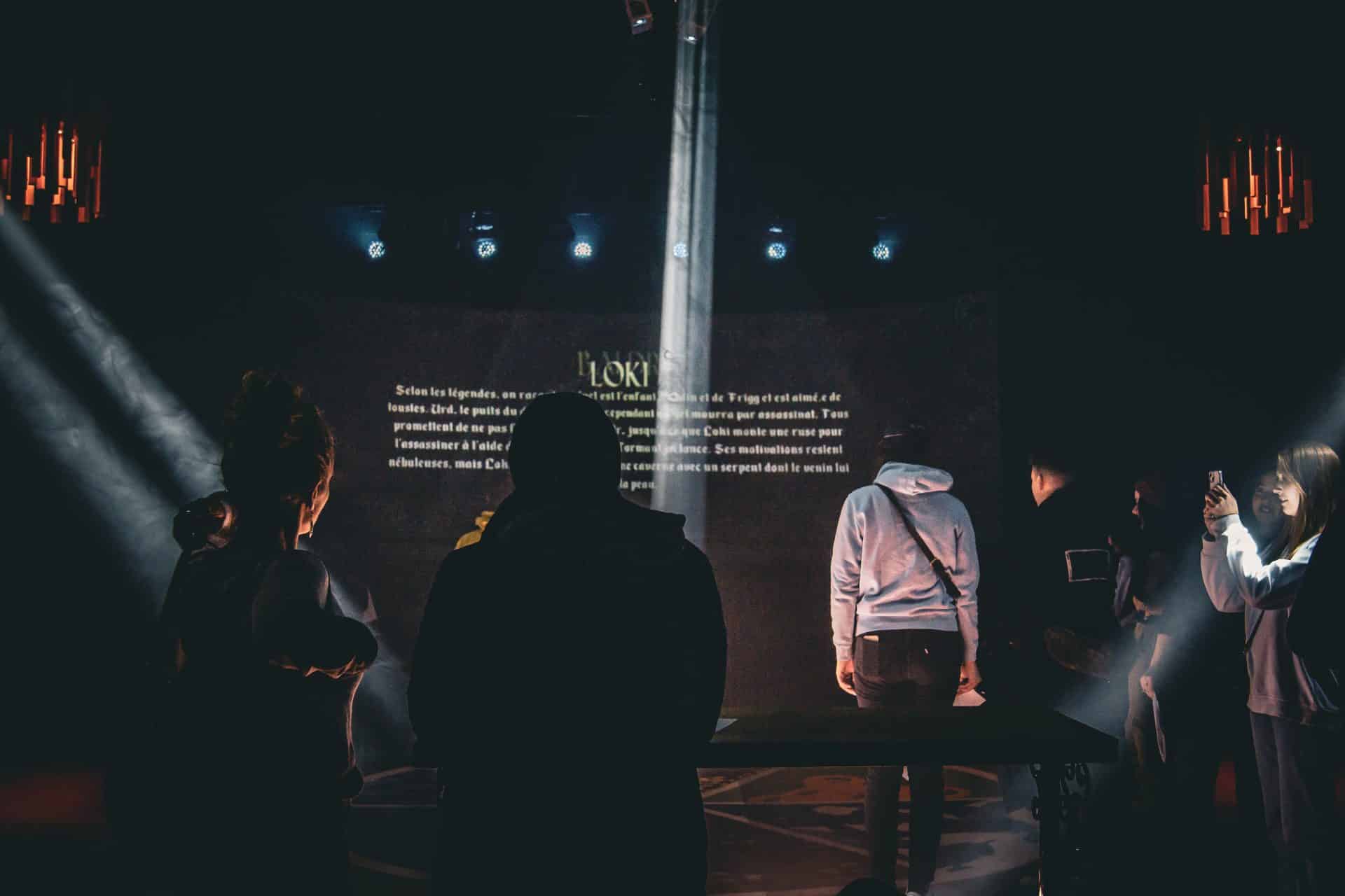 Ainsi, tout au long du parcours, les spectateur·rices passaient d’une ambiance sonore, visuelle et lumineuse à une autre en fonction des actions qu’ils réalisaient. À l’étage, iels pouvaient discuter dans une taverne viking et découvrir quelques divinités à l’aide de la roue des dieux·déesses interactive. Dans les escaliers, il fallait enclencher les épées de Heimdall, pour activer le portail arc-en-ciel de DEL. Venait ensuite la rencontre avec Hel, gardienne de Helheim qui hébergeait les esprits des morts déshonorables. Sa voix résonnait tout au long du parcours pour mettre en garde le·la spectateur·rice que la présence des vivant·es n’était pas la bienvenue au royaume des morts. Après être remonté des tréfonds du monde, le public assistait au Ragnarök, narré sur scène par la comédienne Camille dans une ambiance rouge sang. On comprend alors que les vikings voyaient le monde comme une succession de périodes de catastrophes puis de reconstruction et ce selon un cycle infini.