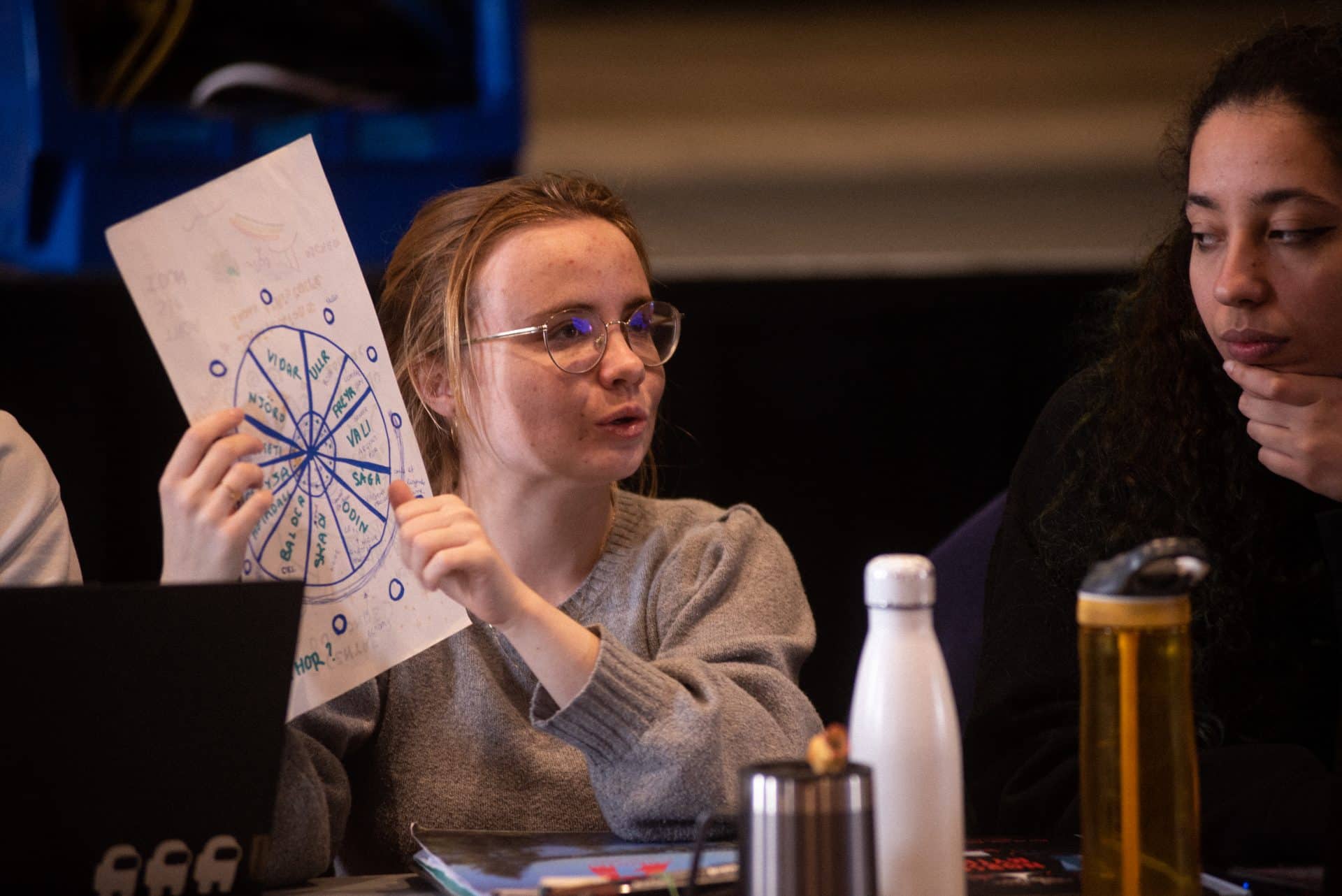 Au sein de ce bouillonnement silencieux déambulait Camille Deslauriers Ménard ayant pour mission de lier entre elles toutes les stations et donner au tout une cohérence scénaristique. C’est aussi elle qui a soulevé l’importance de prendre conscience que ce que nous connaissons de la culture viking provient bien souvent de sources écrites par les chrétiens qui essayaient d’assimiler les population vikings à leur religion. La mythologie des vikings, transmise de façon orale, n’a laissé derrière elle que très peu de traces écrites et c’est avec l’aide d’Iduun Isdrake, une consultante suédoise et porteuse de savoirs, que les étudiant·es ont pu coller le plus possible à la réalité de la culture viking en évitant les ajouts de la chrétienté. Il a par exemple été décidé d’écrire les notices en langue inclusive puisque le genre des dieux·déesse était indéfini ou changeant. Malgré cela, il faut bien garder en tête que l’expérience proposée reste une interprétation et une adaptation de cet univers et qu’elle ne fait qu’emprunter à la culture scandinave sans prétendre être historiquement juste.