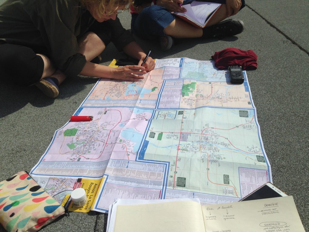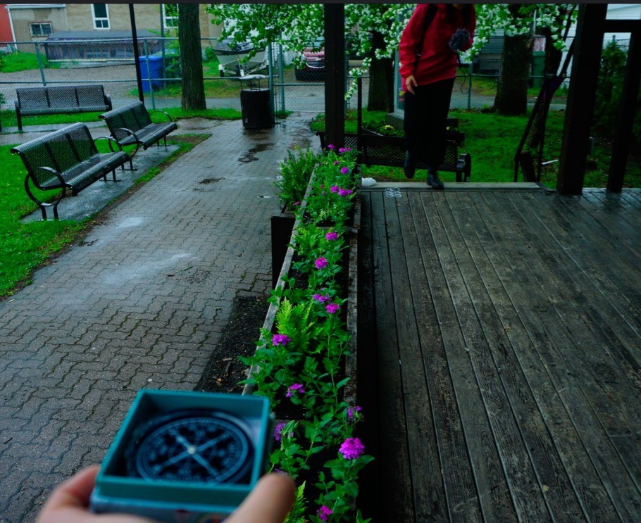 De gauche à droite : Assises sur le banc : Elise et Caroline ; debout : Catherine ; sur l’autre banc, Marie-Hélène et Valentin ; sur le banc perpendiculaire : personne. Hors du cadre : assis dans les marches, Normand ; debout sur les marches notant dans un calepin : Giulia ; à l’autre bout du pavillon tenant une boussole : Natalie.