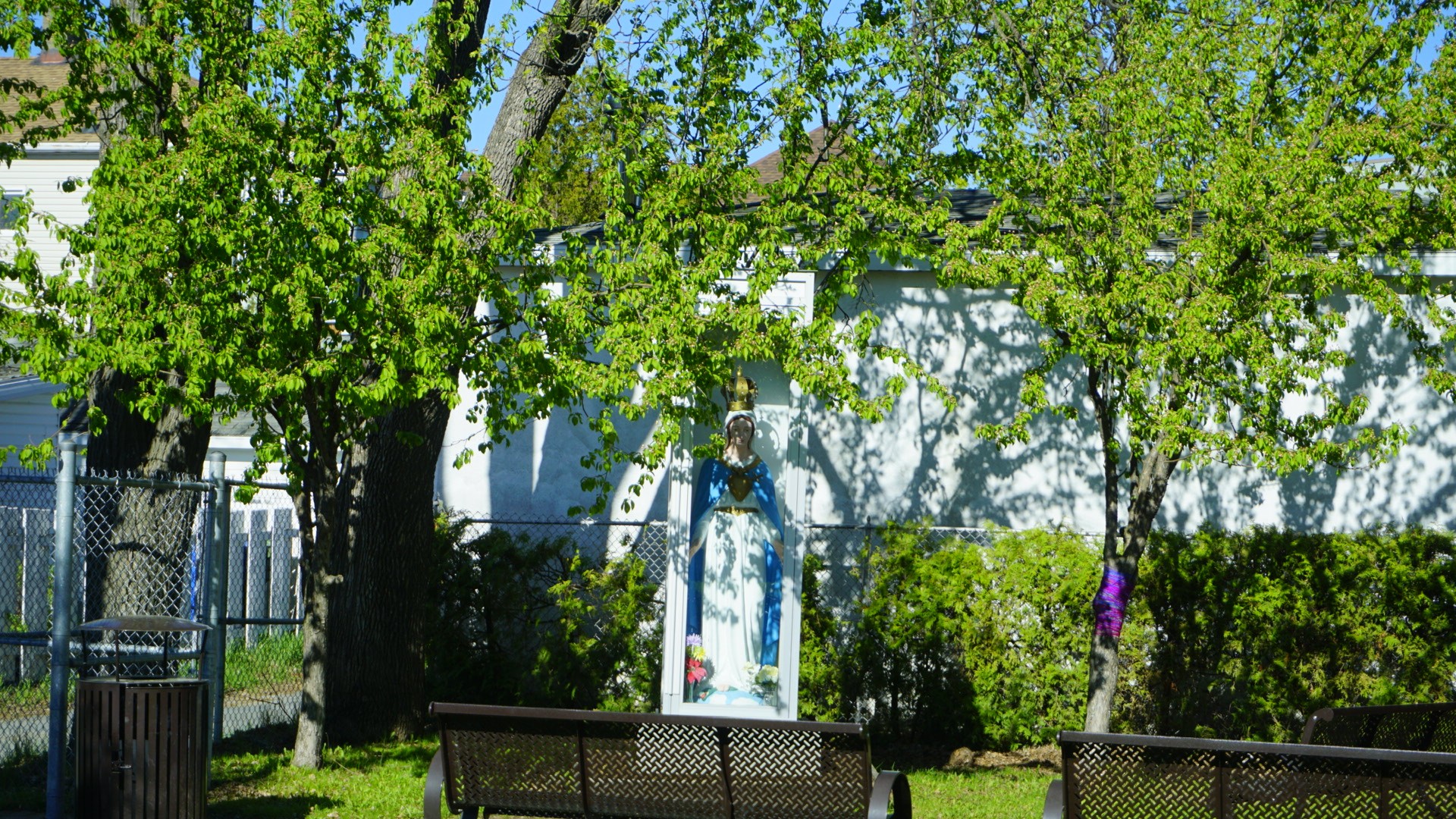 Derrière sa vitrine, la Vierge accueille. Mains ouvertes. Point de repère.