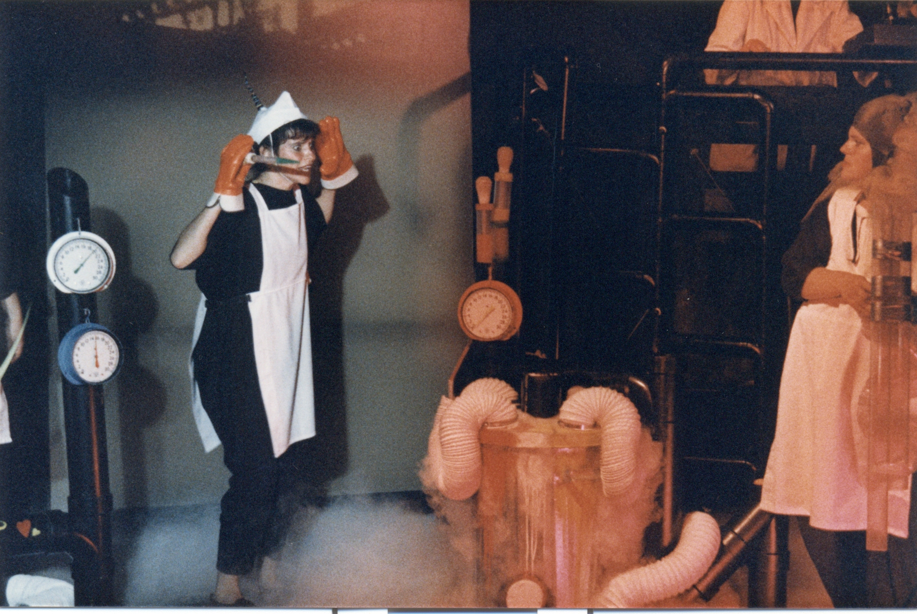 Précurseures du virage que prendra, presque 25 ans plus tard, le Petit Théâtre du Vieux Noranda, Les Zybrides font appel à l’audio-visuel pour illustrer et imager leur pièce. La première partie, l’histoire de l’humanité, défile telle une bande dessinée grâce à trois projecteurs qui projettent des diapositives sur des écrans géants qui tantôt amplifient les mouvements, tantôt créent une atmosphère propice à l’action. Dans la deuxième partie, le·la spectateur·rice est immergé·e dans un décor d’usine fait de tuyaux de plastique noir.