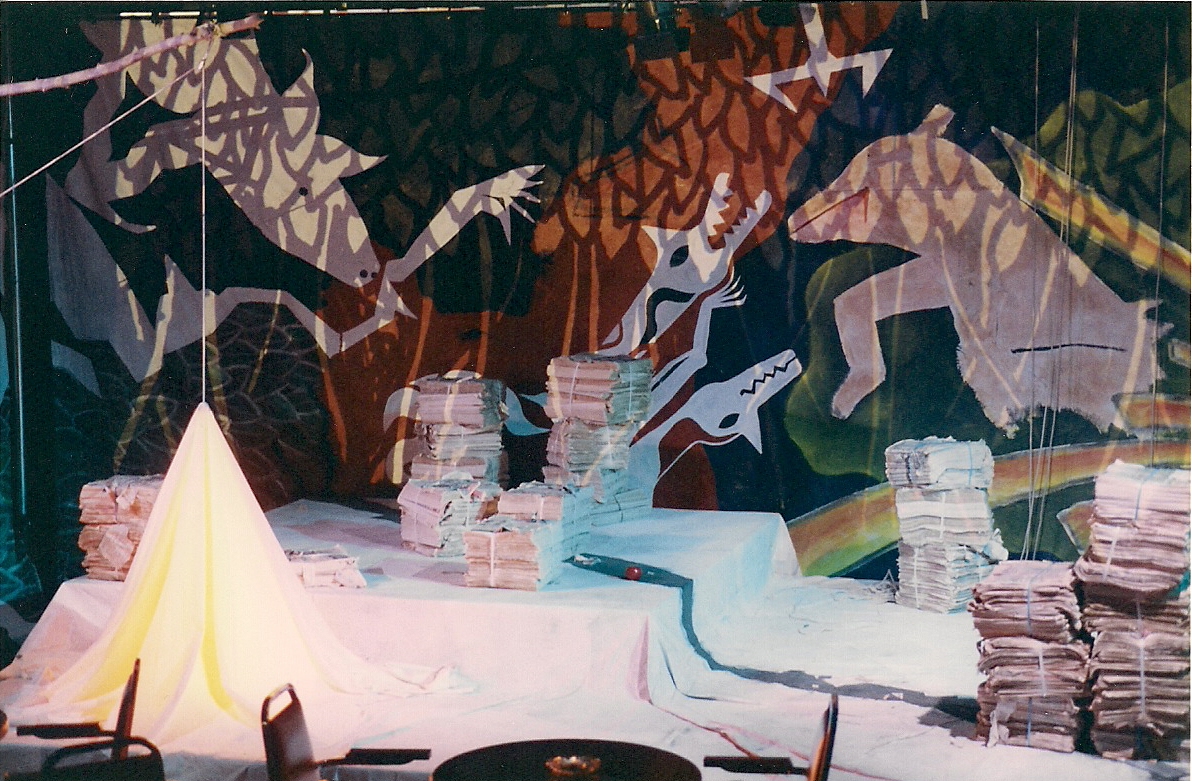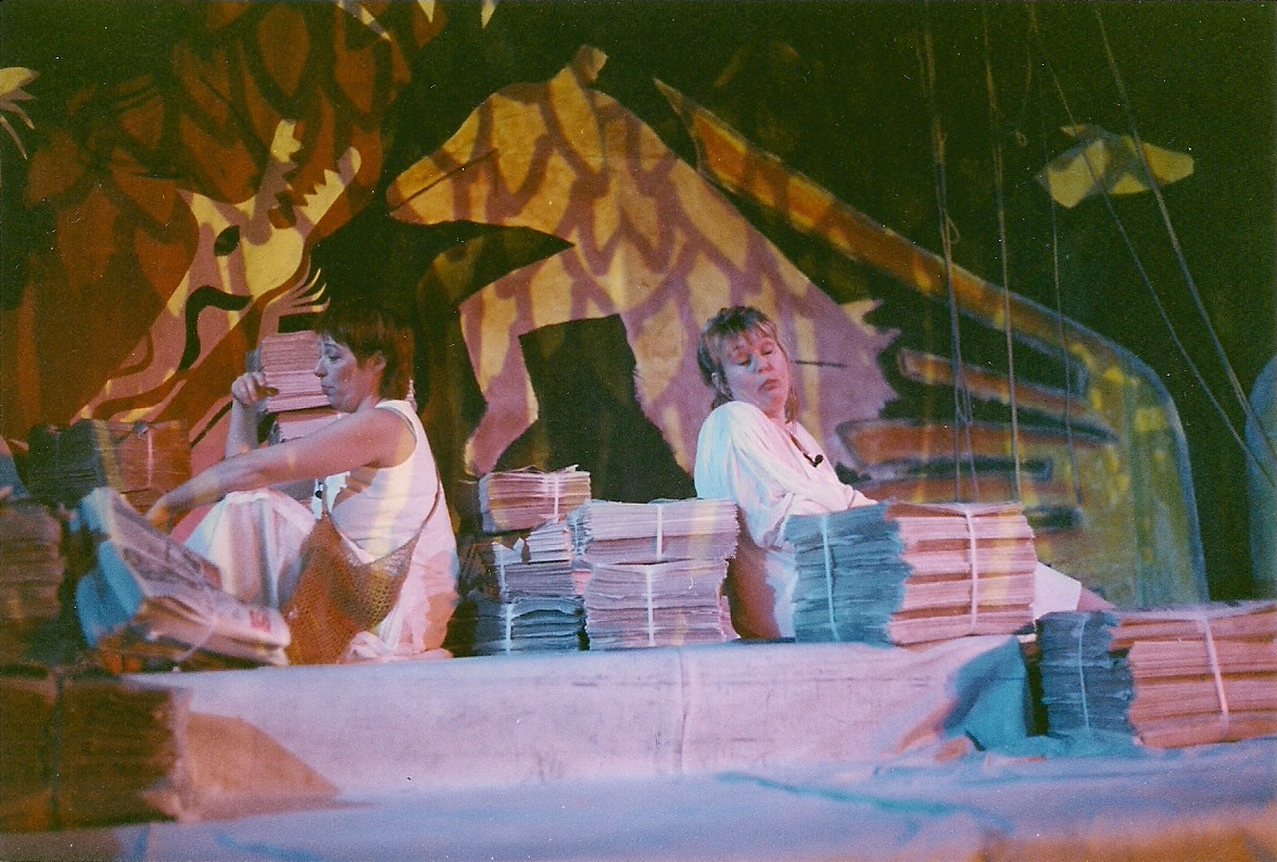 Le dispositif scénique est constitué d’une immense toile peinte où la nature y est fortement présente, dans un traitement totalement abstrait. Cette toile entoure un espace scénique à deux niveaux sur lequel sont disposées des piles de journaux. L’éclairage est efficace : il découpe bien l’espace et isole à l’occasion un élément de la toile pour en transformer notre perception.